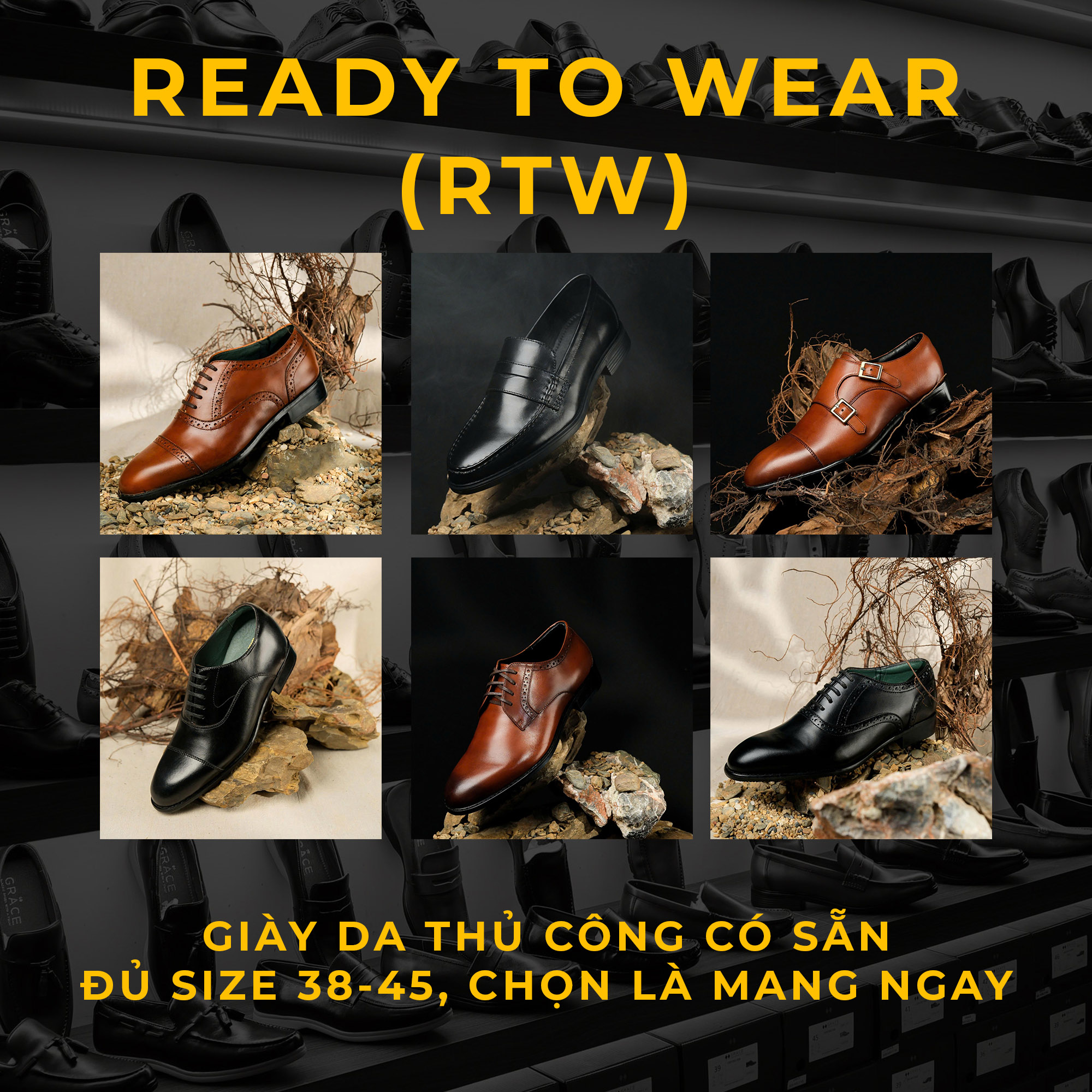 Với 4 cấp độ dịch vụ Ready-to-Wear, Made to Order, Made to Measure, và Bespoke, Grace đáp ứng mọi nhu cầu – từ sự tiện lợi, nhanh chóng đến cá nhân hóa tuyệt đối. Mỗi đôi giày đều được chế tác thủ công tỉ mỉ, sử dụng da cao cấp và kỹ thuật đóng giày chuẩn quốc tế, mang lại trải nghiệm hoàn hảo cho đôi chân của bạn.